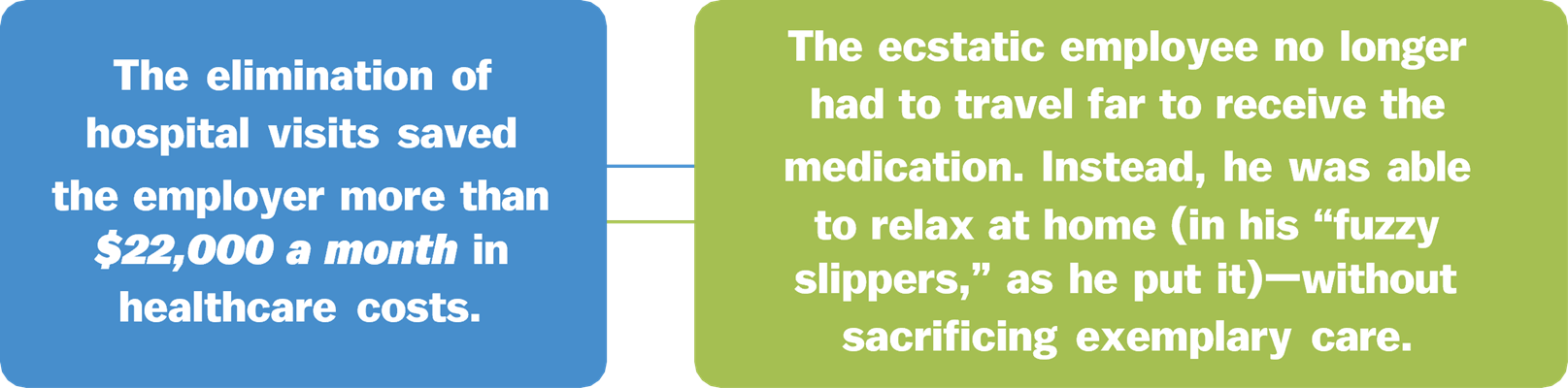 One of EVHC’s customers experienced these challenges firsthand. An employee was receiving regular treatments of Remicade, a drug that treats arthritis and other ailments. Every six weeks, the employee had to travel 40+ miles round trip to and from the hospital and spend six hours receiving the infusions. Each treatment cost the employees’ company a staggering $27,000.